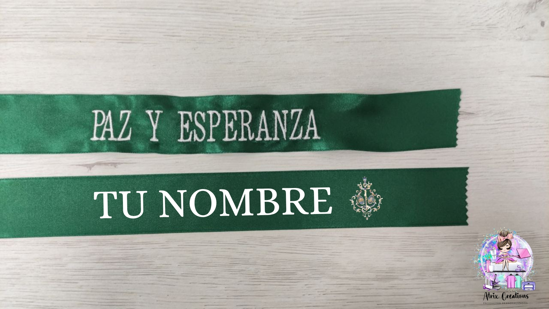 En un extremo bordado Paz y Esperanza y en el otro se bordará el nombre que indiques.
