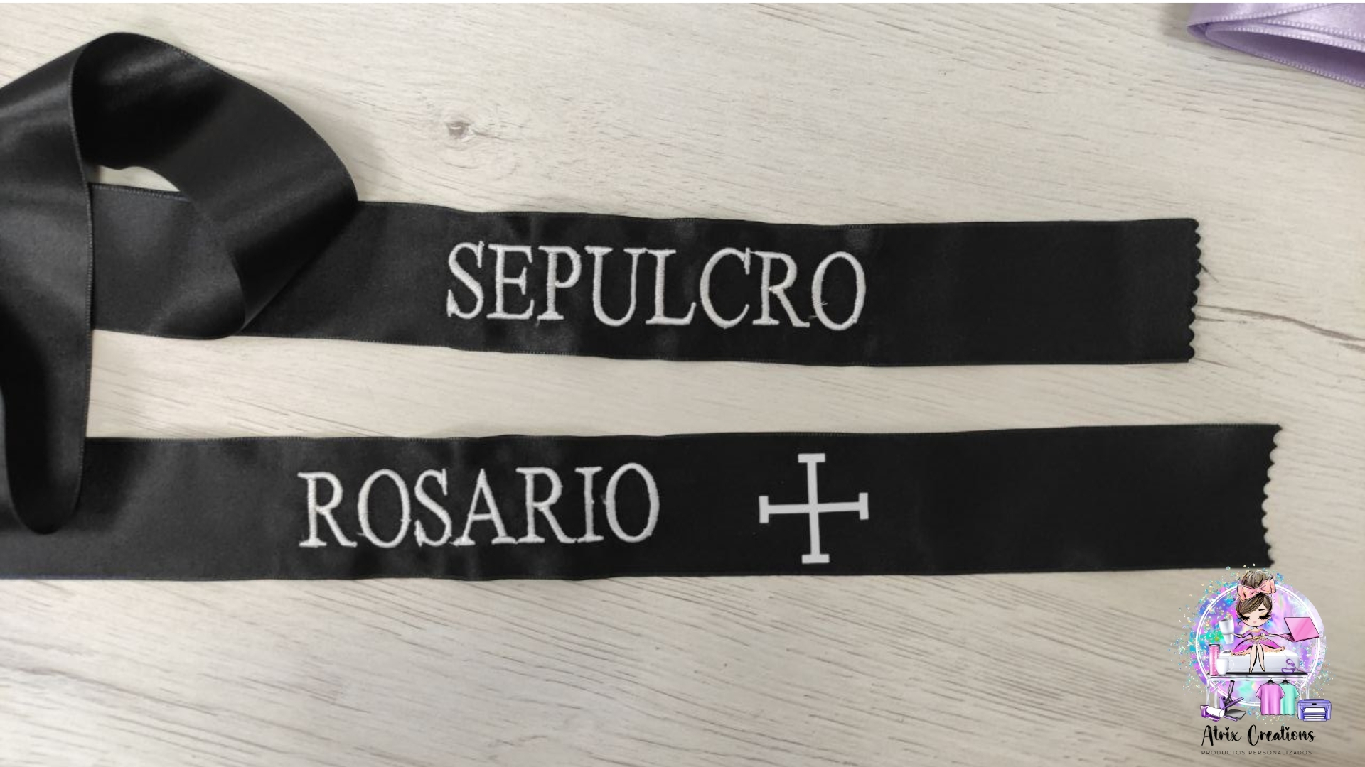En un extremo bordado Sepulcro y en el otro se bordará el nombre que indiques.